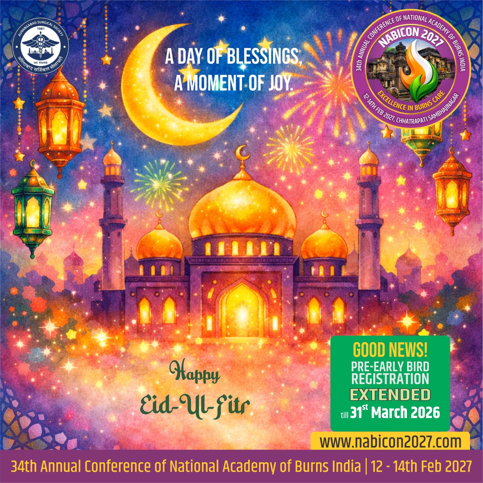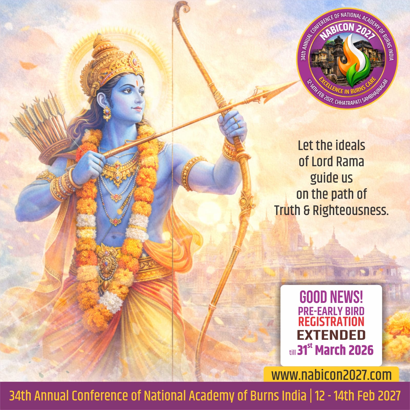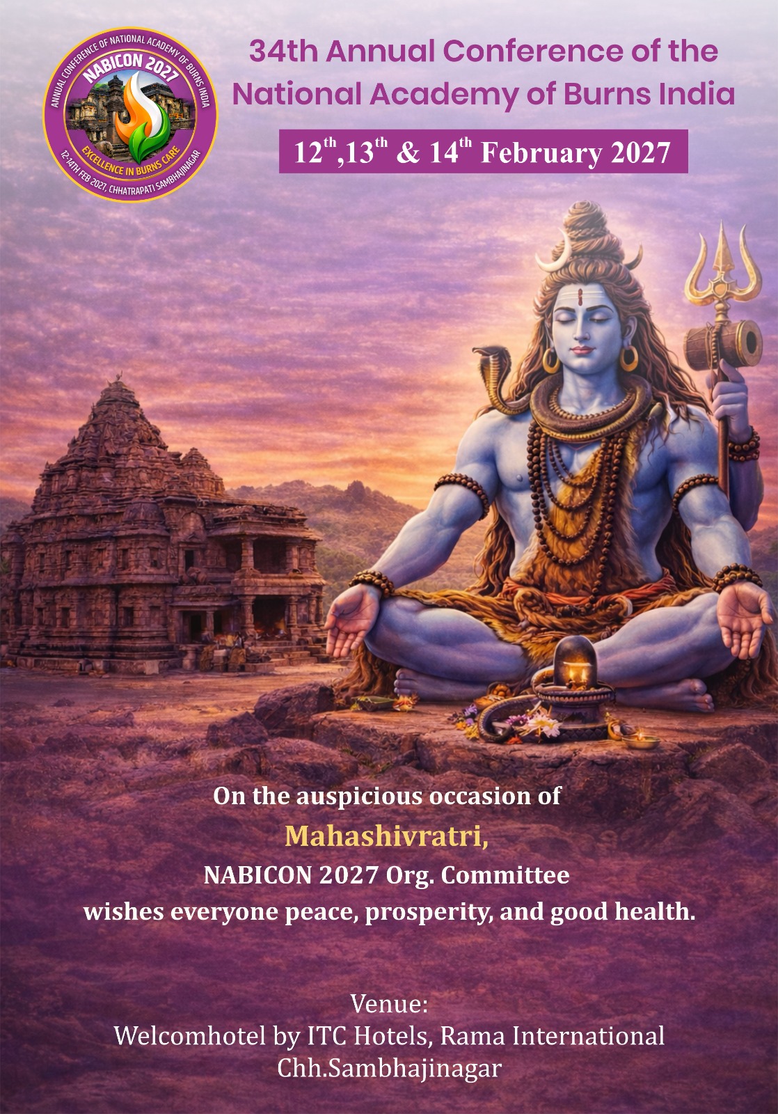 It is with great pleasure, deep pride, and heartfelt warmth that we invite you to the 34th Annual Conference of the National Academy of Burns India – NABICON 2027. The conference is scheduled to be held from 12th to 14th February 2027 at Welcomhotel By ITC Hotels, Rama International, Chhatrapati Sambhajinagar (Aurangabad).